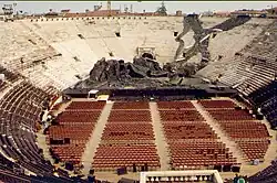 Dance and classic concert performances have also been given in the Arena. Classical ballets and traditional dances from all over the world have been seen. In 1976, Maurice Béjart brought the Ballet du XXe Siècle from La Monnaie in Brussels and choreographed Beethoven's Ninth Symphony. This première was interrupted by rain, but the performance continued to a cassette tape of the music and without the orchestra.