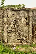 Beside the front entrance of the fortified church complex is a single level, coral-stone structure built together with the church. It was used as a leprosarium during the Spanish period and as an autopsy area for those who died tragically during the American era.[1] The facade's pediment features very ornate carvings of angels and human figures, with skull and bone details that explain the function of the structure.