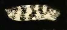 The wingspan is about 9 mm. The forewings are silvery pearly white with light golden markings. The hindwings are whitish gray.[3]