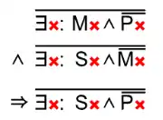 | All men are mortal. All Greeks are men. ∴ All Greeks are mortal. | M a P S a M S a P | ![]() |
