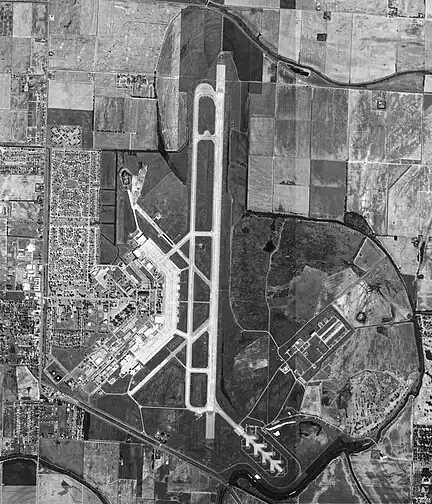 On October 7, 1946, the Army released control of the facility to the city of Blytheville.[3] The city operated the base as the Blytheville Municipal Airport, with most of the dorms converted to serve as a veterans housing area, and industrial park.[4] A new administration building was constructed on the site of the WW2 era control tower in 1950, at a cost of $50k, with half of the funding provided by the federal government.[5] The city of Blytheville applied to the Civil Aeronautics Authority multiple times to make the airport a stop on the Chicago and Southern Air Lines main route. But the petitions were never acknowledged.[6]