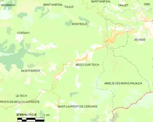 Arles-sur-Tech is located in the canton of Le Canigou and in the arrondissement of Céret.[3]