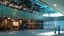 The arena is a two-story symmetrical structure with blue, dark blue, and sky-blue chair-back seats. The second-story deck is separated by glass wall panels and includes a running track.[11] All four corners of the arena have banners dedicating the four intercollegiate sports teams at PCC, including men's soccer, listing their accolades.