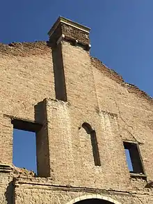 Interior frescoes of Jesus and Mary are heavily damaged but can still be seen. The entrance is damaged and there is no roof left.