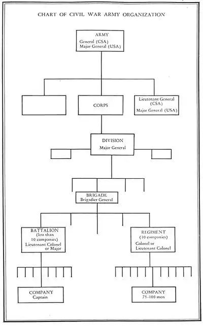 The infantry regiment was the basic administrative and tactical unit of the Civil War armies. Regimental headquarters consisted of a colonel, lieutenant colonel, major, adjutant, quartermaster, surgeon (with rank of major), two assistant surgeons, a chaplain, sergeant major, quartermaster sergeant, commissary sergeant, hospital steward, and two principal musicians. Each company was staffed by a captain, a first lieutenant, a second lieutenant, a first sergeant, four sergeants, eight corporals, two musicians, and one wagoner. The authorized strength of a Civil War infantry regiment was about 1,000 officers and men, arranged in ten companies plus a headquarters and (for the first half of the war at least) a band. Discharges for physical disability, disease, special assignments (bakers, hospital nurses, or wagoners), court-martial, and battle injuries all combined to reduce effective combat strength. Before too long a typical regiment might be reduced to less than 500. Brigades were made up of two or more regiments, with four regiments being most common. Union brigades averaged 1,000 to 1,500 men, while on the Confederate side they averaged 1,500 to 1,800. Union brigades were designated by a number within their division, and each Confederate brigade was designated by the name of its current or former commander.
