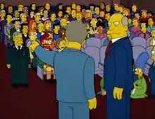 In July 2007, in an article in The Guardian, Ian Jones argues that the "show became stupid" in 1997, pointing to "The Principal and the Pauper" as the bellwether. "Come again? A major character in a long-running series gets unmasked as a fraud? It was cheap, idle storytelling", he remarks.[17] In a February 2006 article in The Star-Ledger, Alan Sepinwall and Matt Zoller Seitz cite the episode when asserting that the quality of The Simpsons "gets much spottier" in season nine.[18] Alan Sepinwall observes in another Star-Ledger article, "[The episode] was so implausible that even the characters were disavowing it by the end of the episode."[19] Jon Hein, who coined the term "jumping the shark" to refer to negative changes in television series, writes in Jump the Shark: TV Edition, "We finally spotted a fin at the start of the ninth season when Principal Skinner's true identity was revealed as Armin Tamzarian."[20] James Greene of Nerve.com put the episode fifth on his list "Ten Times The Simpsons Jumped the Shark", calling it a "nonsensical meta-comedy" and arguing that it "seemed to betray the reality of the show itself".[21] In 2022, on the 25th anniversary of the episode airing, Fatherly looked back negatively at the episode, described the plot twist as the moment the show stopped being perfect, saying: "It wasn’t funny, it was just mean, and the ending of the episode inadvertently made you complicit in its viciousness. Ultimately, the citizens of Springfield decide to force things back to normal by tying the real Skinner to a departing train and legally declaring that Tamzarian’s theft of an entire life is fine. And, well, yeah we as the viewers wanted things to go back to normal once the episode was over, but…this was just heartless."[22]