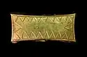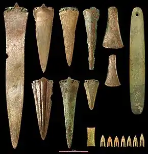 The Armorican Tumulus culture are famous for their tombs of chiefs, richly endowed with prestigious goods deposited in wooden boxes. They deliver dozens of so-called Armorican arrowheads finely cut in blond flint from the Lower Turonian deposits of the Cher valley. They are undoubtedly the work of flint craftsmen and the symbol of the power of the chiefs of the time.[7] Along with his arrows are bronze daggers and axes, the former being kept in leather scabbards and sometimes decorated with small gold studs (1 to 3 mm). One grave can accumulate up to ten daggers – beyond any measure in the rest of Western Europe in the Early Bronze Age. The daggers are of the Armorican type and generally decorated with meshes parallel to the edges and pierced with six rivet holes. More exceptionally, silver goblets, gold or silver chains, pendants and archer's armbands in amber, Whitby jet or gold and large stone sharpeners may be found in these graves.[1][8]