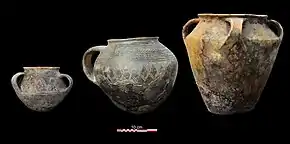Ceramics are never discovered in these chieftains' tombs. It is generally of biconical shape often associated with handles in variable number (1 to 6). It can be decorated with chevrons, hatched triangles and grooves.