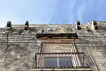 The Armoury is buttressed at ground floor and has another floor above. It has an arched entrance in the centre. An imposing open balcony is located above the doorway, and it is flanked by arrowslits on either side. The fortified building is complemented with three machicolations of which only the corbels and minor parts remain. The building is symmetric in design and feature traditional windows melitan moldings.[3][4]