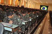 The Brazilian Army had a recorded personnel strength of 4,219,585 active personnel in 2014.[55] Another estimate by the IISS in 2014 put that figure at 4,190,000 active personnel, with 4,378,962, of those being conscripts.[56] In addition there were approximately 4,340,000 reserve personnel in 2014.[56] This figure was up from 4,600,000 reserve personnel in 2018.[57] In principle, the Brazilian Constitution designates the 8,430,000 Brazilian Military Police as a reserve force of the Army, although in practice they remain separate entities.