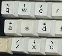 HJKL is a layout used in the Unix computer world, a practice spawned by its use in the vi text editor. The editor was written by Bill Joy for use on a Lear-Siegler ADM-3A terminal, which places arrow symbols on these letters, since it did not have dedicated arrow keys on the keyboard. These correspond to the functions of the corresponding control characters Ctrl+H, Ctrl+J, Ctrl+K, and Ctrl+L when sent to the terminal, moving the cursor left, down, up, and right, respectively.[9] (The Ctrl+H and Ctrl+J functions were standard, but the interpretations of Ctrl+K and Ctrl+L were unique to the ADM-3A.) This key arrangement is often referred to as "vi keys". HJKL keys are still ubiquitous in newly developed Unix software even though today's keyboards have arrow keys. They have the advantage of letting touch-typists move the cursor without taking their fingers off of the home row. Examples of games that use HJKL are the text-based "graphic" adventures like NetHack, the Rogue series, and Linley's Dungeon Crawl. It is also used by some players of the Dance Dance Revolution clone StepMania, where HJKL corresponds directly to the order of the arrows. Gmail, Google Labs' keyboard shortcuts and other websites use J and K for "next" and "previous".[10][11][12]