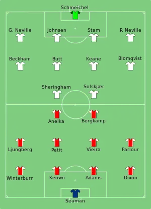 David Beckham scored an early goal for Manchester United, with Dennis Bergkamp equalising in the second half. Roy Keane, United's captain, was sent off, and Peter Schmeichel saved a Bergkamp penalty kick to send the game to extra time.[2][3] Ryan Giggs scored a goal in extra time to give United a 2–1 victory and send them through to the 1999 FA Cup final.[4]