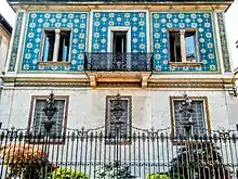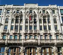The Milanese stage of the liberty style was inaugurated with the construction of the Palazzo Castiglioni, completed in 1903 according to the project of Giuseppe Sommaruga, who would become, according to Sacerdoti, the most prominent interpreter of Milanese art nouveau.[9] The building, decorated with cement sculptures of floral theme and wrought iron compositions typical of the new style, distances itself from art nouveau by its monumental forms and the use of classical elements such as the putti, taken from the nearby noble palaces, where the neoclassical style dominates.[17] The palace, considered by Lopez, Susani and Roiter one of the best examples of Italian art nouveau and built in one of the most elegant streets of Milan, remarked even more clearly the status of the new bourgeois class and introduced with force in the city the use of cement as a sculptural element.[18][19] The "breaking signal" thrown to the old ruling class was even more intense due to the presence on both sides of the entrance of two statues representing two naked women in very daring poses, which caused a great scandal, to the point that the palace was colloquially renamed by the Milanese la ca' di ciapp (the "house of the buttocks") in reference to the subsequent nudity of the two women and the architect was forced to remove them and move them to the then peripheral Villa Faccanoni, another example of a liberty, suburban villa also designed by Sommaruga, in which the putti sculptures and the motif of the windows divided by columns on the top floor of Palazzo Castiglioni were reproduced.[20]