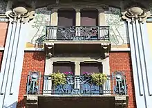 According to Sacerdoti, another leading interpreter of Milanese art nouveau was Giovanni Battista Bossi, who has in the Casa Galimberti his most famous work.[9] The facade of this building presents a complex decoration with ceramic tiles painted with human forms and plant elements that show elaborate chromatic contrasts. Also noteworthy are the decorated balconies made of cement and the wrought iron a baldaquino balconies.[21] A few meters away is the Casa Guazzoni, also by Bossi, which despite retaining the typically floral style of the facade presents a decoration completely centered on sculpture with elaborate putti devices, female figures and plant forms also in cement and wrought iron with overlapping balconies.[22] Bossi lastly designed the Casa Alessio, more akin to the Viennese Secession style with its rigid geometries and the vertical strip in correspondence with the entrance.[23]