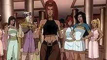 Eventually Wonder Woman found their city while searching for the villain the Cheetah, who had stolen her golden Lasso of Truth.[7] As the Bana-Mighdallian's original Themyscirian language had changed over time to incorporate Middle Eastern dialects, Diana had a hard time communicating with the newly found Amazons. Eventually a battle took place between her and the Bana-Mighdallian's chief warrior or Shim'Tar. Soon an enraged Olympian god Hermes, who was in love with Diana, took vengeance on the desert Amazons for attacking his beloved, and the city of Bana-Mighdall was destroyed.[8] Homeless, the remaining Amazons eventually took up with the witch Circe who was a nemesis of Wonder Woman.[9] It was agreed that in exchange for their servitude during the events of the War of the Gods Circe would grant them immortality and a new home to call their own.[10] It was decided that since the Themyscirian princess was the initial cause of their city being destroyed, they would take over her Amazon city instead. Though only fourteen years of age at this time, Artemis spoke before the Queen and Council to protest the planned attack as she felt that Amazons must not war against each other.[11] Her cries were ignored and the attack was undertaken.[1]