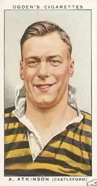 Atkinson was Castleford's captain from around 1930.[9] Under his leadership, the club won the Yorkshire County League in the 1932–33 season. That success included six "doubles" (home and away victories) over opposing teams and an unbeaten record at home, where the only opponent to come away with any league points was the York club.[10] They won the same competition in the 1938–39 season, although he missed a large part of the campaign after injuring his leg in a match at Warrington in January 1939, which eventually resulted in him needing an operation to remove cartilage in March of that year.[11]