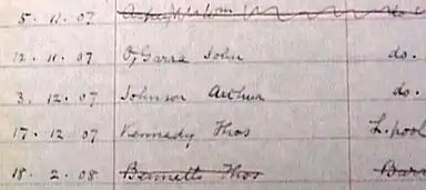 ![]() Extract from Widnes Playing Register for the 1907–08 season showing Arthur Johnson's entry along with his fellow future Great Britain tourist John "Jack" O'Garra | ||||||||||||||||||||||||||||||||||||||||||||||||||||||||||||||||
