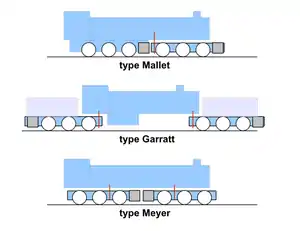 - The Mallet locomotive, with one fixed engine under the rear of the locomotive and a radially swinging engine unit in front.