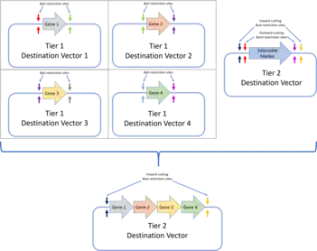 - Tier 2: Tier 2 assembly involves further assembling the genes assembled in tier 1 assembly into multi-gene constructs. If there is a need for further, higher tier assembly, inward cutting BsaI restriction sites can be added to flank the insertion sites. These vectors can then be used as entry vectors for higher tier constructs.