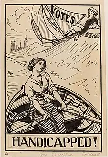 The artist Duncan Grant, whose aunt, Lady Strachey was a member of the National Union of Women's Suffrage Societies, entered the ASL poster and postcard competition in 1907. Although not a prize winner, he was encouraged to enter the ASL’s 1909 competition for a poster that was "suitable for use at elections". ASL member Barbara Forbes suggested "a man in a sailing boat (the sail represents the Vote). A woman with only oars - out in the sea of Labour". Grant was awarded the first prize, four pounds, for a poster depicting a woman heading towards the Parliament of the United Kingdom rowing a boat in heavy seas, while a man in a sailing boat effortlessly passes her on a high wave. Grant added the caption "Britons, why handicap the weaker vessel?", which was shortened to "Handicapped!" in the poster published by the ASL. It became one of the ASL's most striking posters.[2]