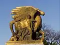 The A. Bruni Foundry in Rome and the Fonderia Lagana in Naples cast the sculptures[30] using the lost-wax casting process.[64] The foundries intended to use fire-gilding to finish the statues. Fire-gilding is a process in which gold leaf and mercury are applied to the bronze. Fire is applied to the area, which causes the gold to adhere to the bronze and the mercury to evaporate.[30] But several problems were encountered during both the casting and gilding phases. The foundries wanted to use joints that while less expensive to cast would not wear well, and the sculptors were forced to intervene to achieve the required quality. Samples of fire-gilded bronze were shipped to the United States, where it was discovered the color was too bright. This required both sculptors to intervene again to achieve the correct color. Minzolli then visited the foundries to check on the castings. He discovered that the Bruni foundry did excellent casting, but its gilding was poor. The casting at the Fonderia Lagana foundry was also of high quality, but not quite as good as that in Rome. Its gilding was better than the Roman foundry's, however. Fraser looked into moving part of the casting work to the Artistic Foundry Battaglia[65] in Milan and the Ferdinando Marinelli Artistic Foundry in Florence.[66] The Milan foundry's work was at least as good as that done at the Neapolitan foundry. The Florentine foundry, however, did good casting work but exceptionally poor gilding. In the end, the gilding work on Valor was done in Milan and Sacrifice in Florence. The Rome foundry did both casting and gilding on Aspiration and Literature, while Naples did casting and gilding for Music and Harvest.[64][67] Spending $58,000 ($653,913 in 2023 dollars) on gold, more than 100 pounds (45 kg) of 24-karat gold (currently worth $2,625,000) was used in the gilding process.[55][68][69]