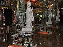 There are 10 white marble statues standing 120 centimetres (47 in) tall each. According to the name plaques, these are Gautama Buddha, Guru Nanak Dev Ji, Sai Baba and Mother Teresa. The Guru believes that these are messengers of God, and visitors of other faiths will be happy to see them here.
