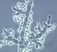 • blastic-acropetal (repeated budding at the tip of the conidiogenic hypha, so that a chain of spores is formed with the youngest spores at the tip),