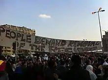 Ash-shaʻb yurīd isqāṭ an-niẓām (Arabic: الشعب يريد إسقاط النظام, lit. 'the people want to bring down the regime', pronounced [æʃˈʃaʕb juˈriːd ʔɪsˈqɑːtˤ ænniˈðˤɑːm]) is a political slogan associated with the Arab Spring.[1][2] The slogan first emerged during the Tunisian Revolution.[3] The chant echoed at Avenue Habib Bourguiba in Tunis for weeks.[2] The slogan also became used frequently during the 2011 Egyptian revolution.[4][5][6][7] It was the most frequent slogan, both in graffiti and in chants in rallies, during the revolution in Egypt.[8]