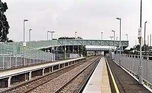 In addition to the A46 road bridge, which does not provide access to the southbound (eastern) platform – the only access to that, including wheelchair access, is by a ramped footbridge over the lines at the station itself.[18] A pushbutton computerised service provides real-time next train announcements. There is a large car park situated adjacent to the northbound (western) platform. The nearest bus stop (from where the Stagecoach West services 41 and 42 depart to Cheltenham Via Tewkesbury and service 71 departs to Gloucester) is in the car park on the west side of the station.
