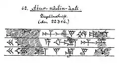 Aššūr-nādin-apli, inscribed maš-šur-SUM-DUMU.UŠ,[2] was king of Assyria (1206 BC – 1203 BC or 1196 BC – 1194 BC short chronology). The alternate dating is due to uncertainty over the length of reign of a later monarch, Ninurta-apal-Ekur, where conflicting king lists differ by ten years. His name meant "Aššur is the giver of an heir"[3] in the Akkadian language. He was a son of Tukulti-Ninurta I.[i 1]
