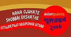 "Asian Paints Sharad Shamman" was started in 1985 as a means for awarding the best decorated puja pandal during Durga Puja in Kolkata. Sharad means "Autumn (as the festival takes place at that season)" and Shamman means "Award/Respect", and was sponsored by Asian Paints, hence the name Asian Paints Sharad Shamman. Out of about 3000 puja pandals in Kolkata, few get shortlisted and among them six are given the awards.[2][3][4]