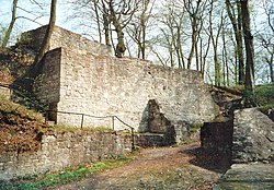 The Asseburg is a ruined hill castle on the narrow, southern crest of the Asse ridge in the Harz Mountains of Germany, not far from Wolfenbüttel. The castle was built around 1218 by Gunzelin of Wolfenbüttel and his descendants of the House of Asseburg, as a so-called Ganerbenburg, or castle managed and occupied by more than one family or branch. Based on its dimensions, this elongated fortification was the largest hill castle in North Germany and was considered impregnable. Its purpose was to secure the lands around Wolfenbüttel.