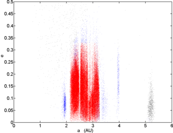 - ↑ This value was obtained by a simple count of all bodies in that region using data for 120,437 numbered minor planets from the Minor Planet Center orbit database, dated February 8, 2006.