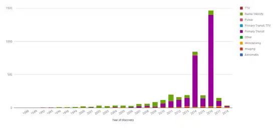 Exoplanets found by different search methods each year through 2018, transit method in purple.