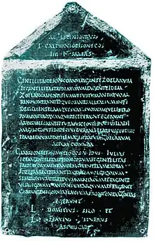 As for epigraphy, 83 inscriptions from Astorga are known, to which should be added 21 found in the surrounding area and 7 from other parts of the Peninsula but related to the city or the Asturicense Convent.[6] Most of them are of a funerary nature (64), followed in number by votive inscriptions (17). The oldest date back to the first century and allude to military themes, especially those related to the Legio X Gemina. The remaining ones belong to the 2nd and 3rd centuries; in them, among which two in Greek stand out, administrative and government positions are mentioned, such as Legati, Procuratores Augusti, procurator Asturiae et Gallaeciae, Augusti Dispensator, and Praeses Provinciae.[7]
