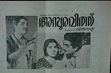 Asuravithu is a 1968 Indian Malayalam-language film directed by A. Vincent, starring Prem Nazir and Sharada. The film was scripted by M. T. Vasudevan Nair, based on his own novel Asuravithu.[1] Set in a Kerala village in the 1960s, the political melodrama focuses on Hindu-Muslim unity. The film portrays the plight of the protagonist, the youngest son of a proud Nair tharavadu, as he is trapped between the social scenario, social injustice and his own inner consciousness. Prem Nazir's acting in the movie was well appreciated by the viewers.