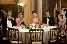 ![]() (from left to right) Emile Calvet (Ronald Guttman), Marie Calvet (Julia Ormond), Megan (Jessica Paré), Don (Jon Hamm), and Sally Draper (Kiernan Shipka) reflect on recent events at the American Cancer Society dinner. | |