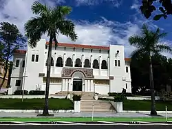 In 1922 the Aguadillan architect, Francisco Roldán Arce was asked to draw up plans for the present building. The cornerstone was laid on 27 May 1923 in the presence of José Coll y Cuchi.[16] The architecture of the building, Spanish Morisco, was introduced to Puerto Rico by Pedro de Castro, who also built some of the structures that neighbor close by. De Castro's tropical and mediterranean conscience objected to the architecture imported from the north, giving preference to the luminosity of the Caribbean, to the visual continuity of the spaces, to the galleries and balconies that served as a transition between interior and exterior spaces, shaped by the urban environment, the countryside or the inner courtyards.[17]