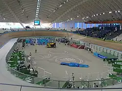 The Athens Olympic Velodrome is a velodrome stadium that is located in Marousi, Athens, Greece, at the Athens Olympic Sports Complex. The venue, which have the capacity for 5,250 people, but only 3,300 seats were used due the security measures available for the 2004 Summer Olympic Games and the 2004 Summer Paralympics. It has distinctive twin roofs, covering the stands on each side.