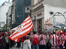 Athletic began playing in an improvised white kit, but in the 1902–03 season, the club's first official strip became half-blue, half-white shirts similar to those worn by Blackburn Rovers,[44] which were donated by Juan Moser. Later, a young student from Bilbao named Juan Elorduy, who was spending Christmas 1909 in London, was charged by the club to buy 25 new shirts, but was unable to find enough. Waiting for the ship back to Bilbao and empty handed, Elorduy realised that the colours of the local team Southampton[45] matched the colours of the City of Bilbao, and bought 50 shirts to take with him. Upon arriving in Bilbao, the club's directors decided almost immediately to change the team's strip to the new colours, and since 1910, Athletic Club have played in red and white stripes. Of the 50 shirts bought by Elorduy, half were then sent to Atlético Madrid, where Elorduy was a committee member and a former player; it had originally begun as a youth branch of Athletic Bilbao.[46][47][48][49][50] An investigation in 2023 proposed an alternative kit origin location as Sunderland.[51] Before the switch, only one other team in Spain wore red and white: Sporting de Gijón, since 1905. Change colours have often been blue and/or white, or black. In 2011, Athletic released a green, white and red away kit inspired by the Basque flag (this was worn against Atlético Madrid in the 2012 UEFA Europa League final).