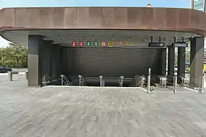 A stair, an elevator, and a set of escalators lead to Barclays Center at the southeast corner of Atlantic and Flatbush Avenues.[156][157] The elevator is privately maintained and, during the 2010s, was one of the least reliable in the New York City Subway system.[177][178] This subway entrance has a sloped roof that faces Barclays Center and is surrounded by wooden benches and gray pavers.[179] A green roof was installed above the subway entrance as part of the construction of Barclays Center Plaza.[180] Formerly, a stair led to the sidewalk at the southeast corner of Flatbush and Atlantic Avenues, but this stair had been closed by the 2000s.[170]: 33