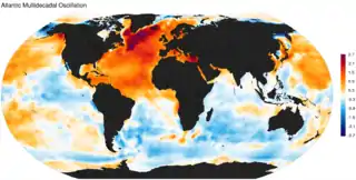 The Atlantic Multidecadal Oscillation (AMO), also known as Atlantic Multidecadal Variability (AMV),[1] is the theorized variability of the sea surface temperature (SST) of the North Atlantic Ocean on the timescale of several decades.[2]
