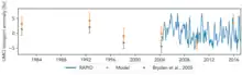 Direct observations of the strength of the AMOC have been available only since 2004 from the RAPID array, an in situ mooring array at 26°N in the Atlantic, leaving only indirect evidence of the previous AMOC behavior.[72][68] While climate models predict a weakening of AMOC under global warming scenarios, they often struggle to match observations or reconstructions of the current. In particular, observed decline in the period 2004–2014 was of a factor 10 higher than that predicted by climate models participating in Phase 5 of the Coupled Model Intercomparison Project (CMIP5): however, some scientists attributed this to a larger-than-anticipated interdecadal variability of the circulation, rather than a climate-forced trend, suggesting that the AMOC would recover from it in only a few years.[73][74] In February 2021, a study indicated that the AMOC did in fact recover from that decline, and found no evidence of an overall AMOC decline over the past 30 years.[70] Likewise, a Science Advances study published in 2020 found no significant change in the AMOC circulation relative to 1990s, in spite of the substantial changes in the North Atlantic Ocean over the same period.[75]