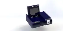 APPI has also been effectively applied for ambient ionization applications lending itself to several practical configurations. One configuration termed Desorption APPI (DAPPI) was developed by Haapala et al. and is pictured in the figure here. This device has been applied to the analysis of drugs of abuse in various solid phases, drug metabolites and steroids in urine, pesticides in plant material, etc.[29][30] APPI has also been interfaced to a DART (direct analysis in real time) source and shown for non-polar compounds such as steroids and pesticides to enhance signal by up to an order of magnitude for N2 flow, which is preferred for DART because it is significantly cheaper and easier to generate then the higher performing use of He. Commercial APPI sources have also been adapted to accept an insertable sampling probe that can deliver or liquid or solid sample to the nebulizer for vaporization and ionization. This configuration is similar to atmospheric solid analysis probe (ASAP) that is based on the use of APCI and therefore is referred to as APPI-ASAP. The benefits of APPI-ASAP vs. APCI-ASAP are similar to those observed in LC/MS, namely higher sensitivity to lower polarity compounds and less background signal for samples in complex matrices.[31] As much as ambient ionization has experienced a renaissance in the last decade or so, in fact this application has been practiced in the security industry for many decades. Just recall the swab detections we have all experienced at airports. The swabs collect condensed phase material from surfaces and are then inserted into a thermal desorber and ionizer assembly that then flows into the ion detector, which in most cases are an ion mobility spectrometer (IMS), but in later cases have been MS analyzers. A picture of a swab-APPI-IMS system used in airports and other security venues is given in the left figure