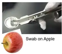 In fact, a swab-APPI-MS system designed for explosives and narcotics detection for security applications performs very well for all types of ambient analysis using a sampling wand and swab (right figure). A particular demonstration (unpublished) showed excellent sensitivity and specificity for detection of pesticide compounds on a variety of fruits and vegetables showing detection limits for 37 priority pesticides ranging from 0.02 to 3.0 ng well below safe limits.[32]