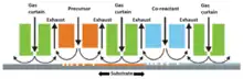 In temporal ALD the separate precursor and co-reactant doses are separated from each other in time by a purge step. In contrast, in spatial ALD (s-ALD), these gases are delivered at different locations, so they are separated in space. In atmospheric pressure s-ALD the precursor and co-reactant are delivered continuously and they are separated from each other by a gas curtain to prevent gas phase reactions. Such gas curtain typically consists of nitrogen injection and exhaust positions, see Figure 1. As a substrates moves through the different gas zones, self-limiting reactions take place at the substrate surface and the ALD process takes place. As this process can easily be accelerated, the deposition rate for spatial ALD can be much higher than for conventional ALD. For example, for ALD of Al2O3 the deposition rate increases from 100-300 nm per hour to 60 nm per minute [5].