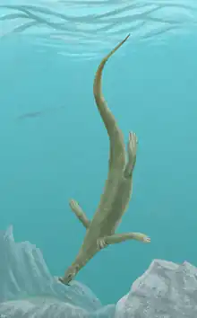 | Life restoration in a swimming posture, with Dinocephalosaurus in the background | |