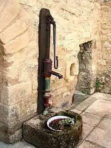 The soils of the commune are formed on a substrate which is mainly limestone: this limestone is also used to roof the housing.[7] The village is however located on a hill of red marl of the Oligocene period and has yielded bones of large mammals and reptiles (crocodile and turtle). In the Aiguebelle valley (a stream that never runs dry even in the most severe droughts) fossils of plants and fish (Smerdi macrurus) have also been found. The areas of both deposits are classified as geological reserves (included in the Natural Geological Reserve of Luberon) and collecting of fossils is prohibited. Information panels are placed close by. A selection of fossils from there can be seen at the Vachères Museum,[8] at the Natural Regional Park of Luberon Maison du Parc[9] in Apt (Vaucluse), and the National Museum of Natural History in Paris (Jardin des Plantes).