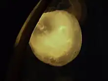 Brown moon jellies have eight rhopalia (sensory structures) and numerous thin and long tentacles.[4] Their bell, or body, is 25–30 centimetres (9.8–11.8 in) in diameter.[3][5] A. limbata has a cup-like calyx.[6] Most of the female A. limbata observed had golden yellow planulae that were located in brood pouches on their oral arms.[3]