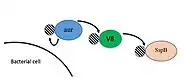 When S. aureus is establishing an infection within a host, it needs to continuously switch from a static, or biofilm forming phenotype, to an invasive, or mobile phenotype. The proteases help mediate this process. Aureolysin appears to down-regulate the formation of biofilms and allow for the mobility of the bacterium. One way it contributes to this change is by mediating coagulation as well as the activation of urokinase. However, it also mediates S. aureus cell wall and secreted proteins to promote this change. For example, clumping factor B is a surface protein that is responsible for the binding of fibrinogen around the bacterium to hide it within a clot.[5][11] Aureolysin is responsible for the cleavage of clumping factor B, which causes the loss of S. aureus binding to fibrinogen. By this mechanism, it may act as a self-regulatory mechanism for dissemination and spreading in combination with activation of fibrinolysis, while the protease simultaneously provides protection against complement activation.[5][11] It has been demonstrated that aureolysin has impact for bacterial survival in human whole blood.[14] Aureolysin is also up-regulated upon phagocytosis and promotes intracellular survival.[5][10][15]